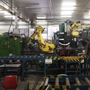 A Ples Zrt. automatizálási csapata tervezte meg és kivitelezte a maró robotcellának az ipari robottal történÅ‘ kiszolgálását. A munkafolyamat bonyolultsága miatt 2 db Fanuc tÃpusú robot végzi a termék mozgatását és a befogó szerszám beállÃtásának műveleteit.